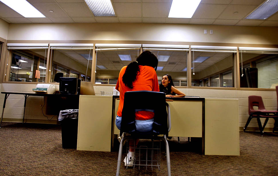 4. Кинтеро слушает девочку в центре задержания проституток в округе Кларк. «Поначалу девочки очень часто думают, что у них появился парень», — говорит Кинтеро об отношениях проститутки и сутенера. (Francine Orr / Los Angeles Times)